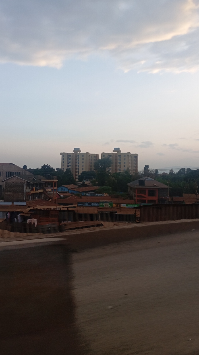 A sprawling cityscape stretches under a sky of soft clouds. Two towering buildings dominate the skyline, positioned behind lower-lying structures. The architecture is diverse, blending modern and traditional styles. In the foreground, a wide surface, possibly a road or expanse of water, blurs from movement, adding a sense of dynamism to the scene. The overall impression is of a vibrant, bustling urban center juxtaposed with a serene sky.