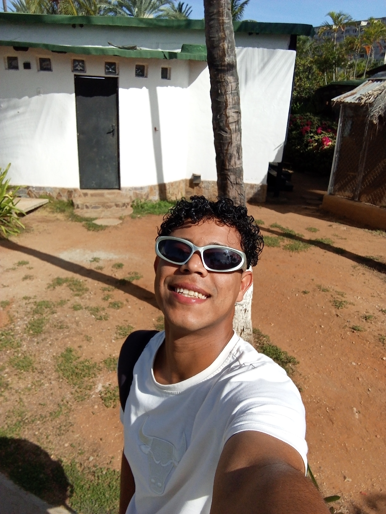 A man is taking a selfie in an outdoor environment. He is wearing a white t-shirt and sunglasses, and he has dark curly hair. Behind him is a white building with a green roof and a dark door. A palm tree is to his right. The ground is reddish-brown with some vegetation. In the background, there's a hut-like structure and some greenery. The location appears to be in a sunny, tropical area. The information available does not confirm the location is in Porlamar, Venezuela.