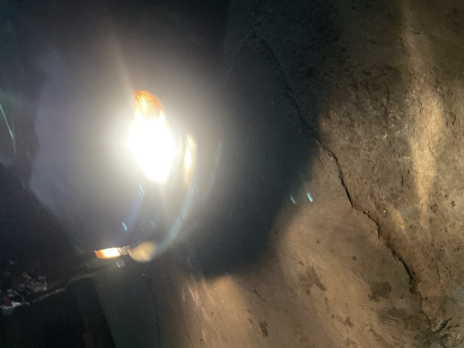 A blurry, bright light dominates the scene, possibly emanating from a vehicle's headlight or similar source, with a distinct orange hue visible at the top. The light reflects on a dark, possibly wet surface. The right side of the image shows textured, earth-toned material, possibly rock or soil, with a prominent crack or seam. The overall composition suggests a dark, confined space like a tunnel or cave.