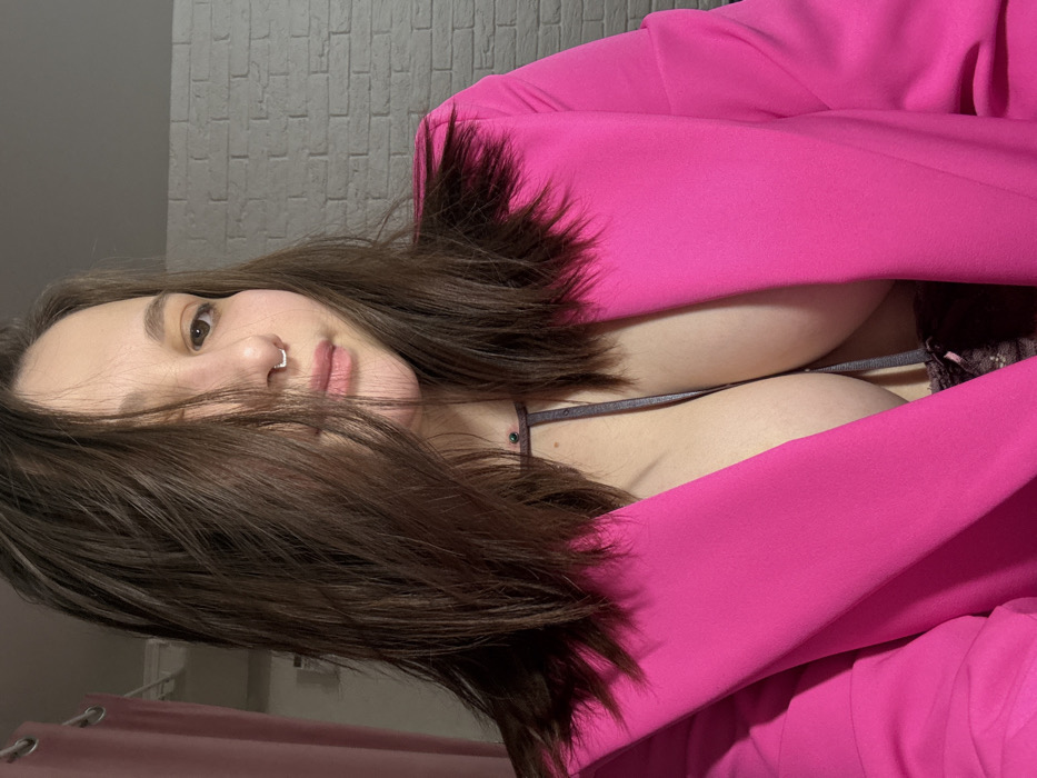 A close-up, chest-up portrait depicts an adult female positioned in an indoor setting. The individual has shoulder-length, dark brown hair, which partially obscures the right side of her face from the viewer's perspective. Her visible left eye is dark, and she exhibits a silver-toned septum piercing. Her lips are slightly parted, and her expression is neutral. She is wearing an unbuttoned, vibrant pink blazer, revealing significant cleavage. A dark, thin-strapped garment, consistent with lingerie or a harness, is visible between her breasts, featuring a small green bead or stud near the base of her throat. The background on the left side of the frame shows a folded pink curtain, while the right side reveals a light-colored, painted brick wall. No specific location within Saratov, Russia, is identifiable from the visual information provided.