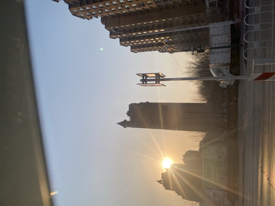 The image displays an urban street scene in Taihe District, China, under low sun conditions, indicating either sunrise or sunset. The sun, positioned in the lower-left quadrant, emits strong light rays and lens flare across the frame. The top 10% of the image is obstructed by a dark, horizontal element consistent with a vehicle's interior. On the left side, two multi-story buildings are silhouetted against the bright sky; the taller structure features a distinct turret-like pinnacle. To the right of these buildings, a tall metal pole supports a rectangular, multi-paneled sign or antenna structure. Along the right side of the frame, a series of modern, multi-story residential apartment buildings, characterized by brown or orange facades and numerous windows, reflect the low sunlight. At street level, a paved road is visible. A white delivery truck with green markings is partially obscured by sun glare on the left. Further right, a white box truck is present. Sparse, bare deciduous trees are visible in the mid-ground between the structures. White metal barriers are positioned along the roadside in the bottom-right foreground. No individuals are depicted in the scene.