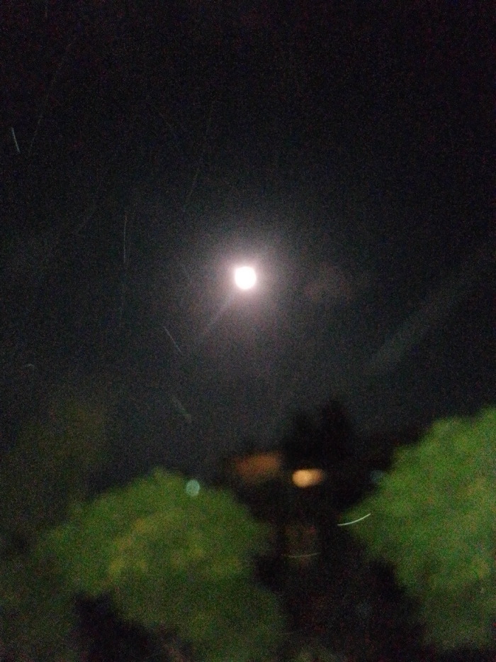 The image displays a heavily blurred, grainy nighttime scene in Barza Municipality, Syria. A bright, circular, overexposed light source, consistent with the moon, is prominently featured in the upper-middle portion of the dark sky. Multiple thin, curvilinear white light streaks are visible scattered across the dark expanse. The lower half of the image shows indistinct, out-of-focus green foliage, likely trees or bushes, with several faint, yellowish-orange light points discernible within, indicating distant artificial illumination. A small, blurry, bluish-green circular light artifact is also present in the lower-left area of the foliage. No individuals or specific actions are identifiable within the frame.