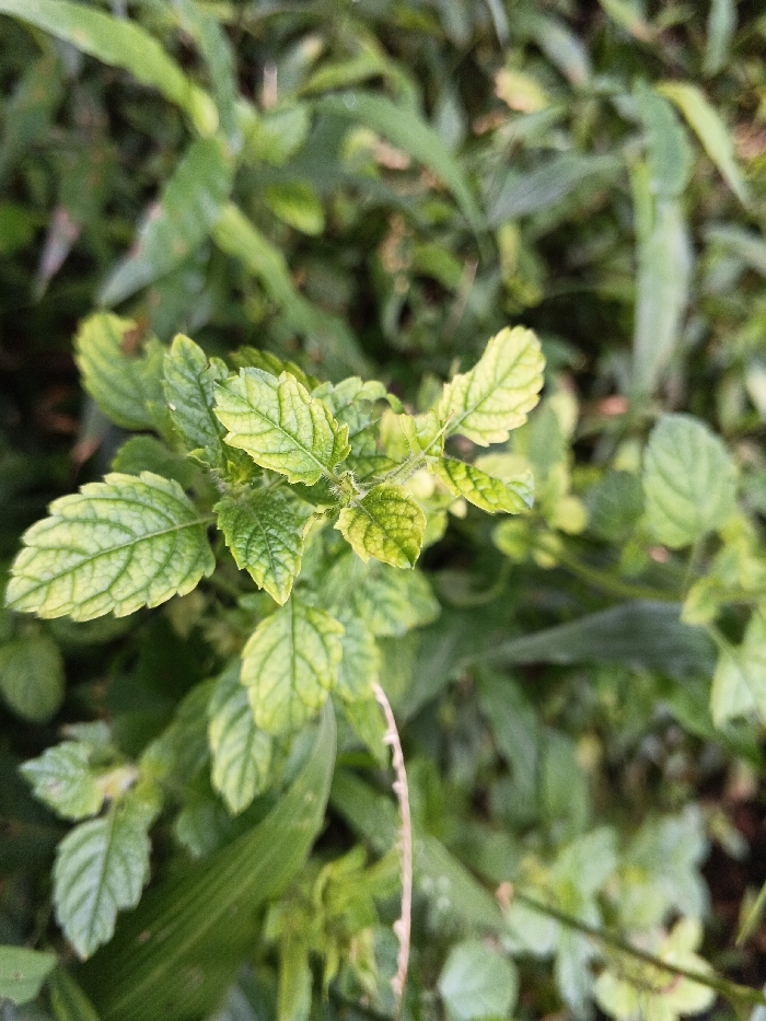 - "A close-up displays a cluster of vibrant green and yellow leaves, possibly mint or a similar herbaceous plant, set against a background of blurred green foliage" by FM-QwlJn1, licensed under CC BY 4.0