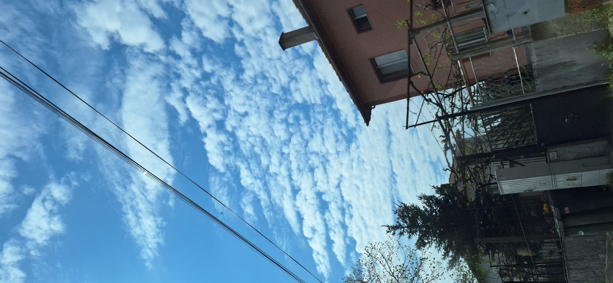 The image captures a street scene in Kresna, Bulgaria. The foreground is dominated by a bright blue sky filled with elongated altocumulus clouds. Electrical wires stretch across the left side of the sky. On the right, there's a section of a pinkish building with two visible windows and a metal chimney. A metal fence with vines growing on it borders the building. Further to the right and below the building, a tree and some overgrown foliage are visible, partially obscuring a white building with a dark gate. A concrete wall is present on the far right. The scene is angled upwards.