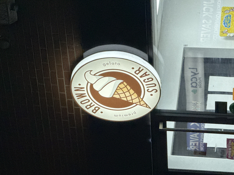 - "The image displays an illuminated, circular sign for "Brown Sugar premium gelato" mounted on a dark brown brick wall" by FM-ZFFKq1, licensed under CC BY 4.0