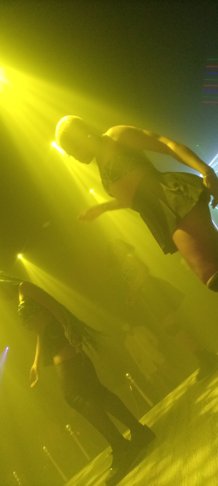 In a dramatically lit, blurry, and tilted photo, several female performers are visible on stage. The foreground is dominated by two women, one with a shaved head and wearing a short skirt, the other with long hair. They appear to be dancing. Several other figures are vaguely seen in the background. The lighting is predominantly yellow, creating a sense of energy and atmosphere.
