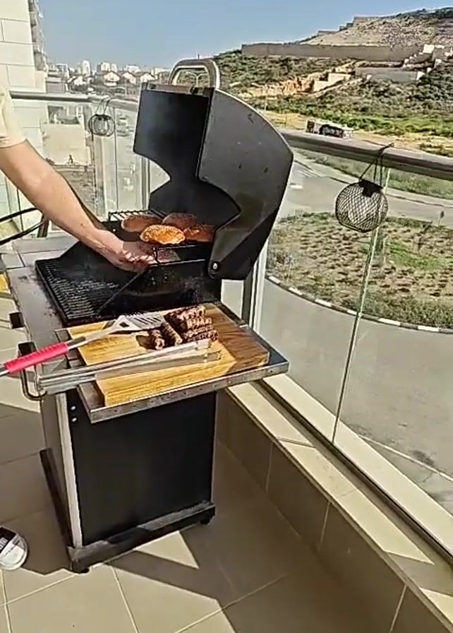 A man is grilling food on a balcony. He is wearing a white shirt and slides. He places a burger on a grill containing other burgers and pieces of meat on a wooden tray. The grill is black with a stainless steel front. The balcony has glass railings. In the background there is a view of a hill, a road and some buildings. Several cars are driving on the road. The sky is blue. A decorative light hangs from the railing.