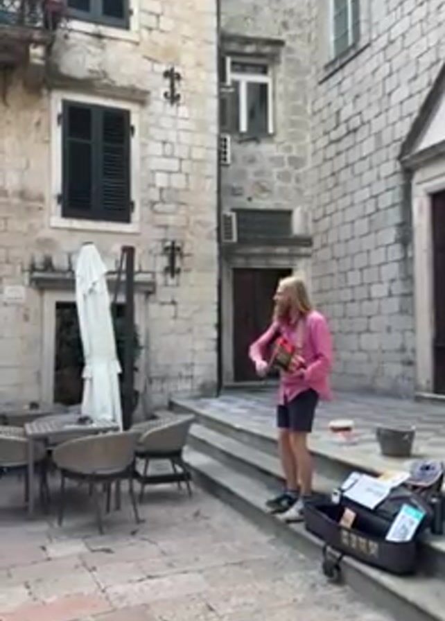 A man with long blonde hair, wearing a pink shirt and navy shorts, stands on a set of steps in a stone-paved plaza and plays a hurdy-gurdy