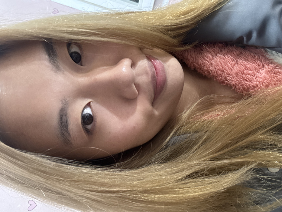 This image depicts a close-up, forward-facing view of a single East Asian female in an indoor setting within Shapingba District, China. The subject has light skin, dark eyes, and dark eyebrows. Her hair is long, blonde, and styled casually, falling around her face. She wears a dark grey or black puffer-style jacket, beneath which a fuzzy, coral-pink garment is visible around her neck. The female is making direct eye contact with the camera and displays a subtle, closed-mouth smile with glossy lips. The background consists of a light-colored wall, featuring two faint, small, pink heart-shaped stickers—one in the upper left corner and another partially obscured on the right. A reflection, possibly from a window or mirror frame, is faintly visible on the right side of the background. The scene is illuminated by soft, diffused light.
