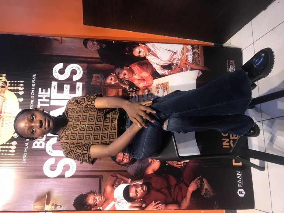 A person sits casually in front of a poster advertising "Blood Sisters." The individual wears a brown patterned shirt, blue jeans, and black shoes. One leg is crossed over the other, revealing a rip in the jeans at the knee. The poster features a group of people depicted in various scenes, hinting at a dramatic narrative. Text on the poster reads, "Every meal is everyone is on the plate" and "Blood Sisters." The logo for "FilmOne Entertainment" and "FAAN" is visible at the bottom of the poster.