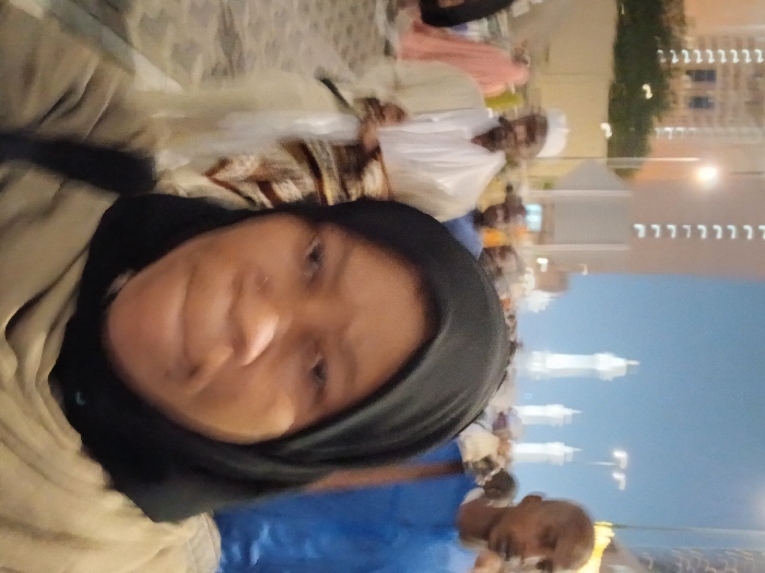 A low-light, slightly blurred selfie-style image captures a crowded outdoor scene at night in Makkah Al Mukarramah, Saudi Arabia. In the immediate foreground, a woman, likely of African descent, with a focused expression and a nose piercing on her right nostril, is seen wearing a black hijab and a light-colored outer garment, facing the camera directly. Her head and upper torso dominate the lower half of the frame. Behind her, a diverse crowd of individuals occupies the midground, appearing to be in motion or gathered. To the left of the central figure, a man in a white thobe and a white head covering is partially visible, looking towards the right. Further back on the left, a person in a pinkish-red garment is discernible. To the far right, a man with a shaved head, wearing a blue top, is also visible, looking towards the right. The background reveals characteristic architectural elements of the city. Against a dark blue night sky, several prominent, slender white minarets with pointed tops are clearly visible, indicative of the Masjid al-Haram complex. To the left of the minarets, a tall, modern building with repetitive, vertically arranged illuminated features is present. The ground appears to be a paved pedestrian surface. The entire scene is illuminated by artificial streetlights and building lights.