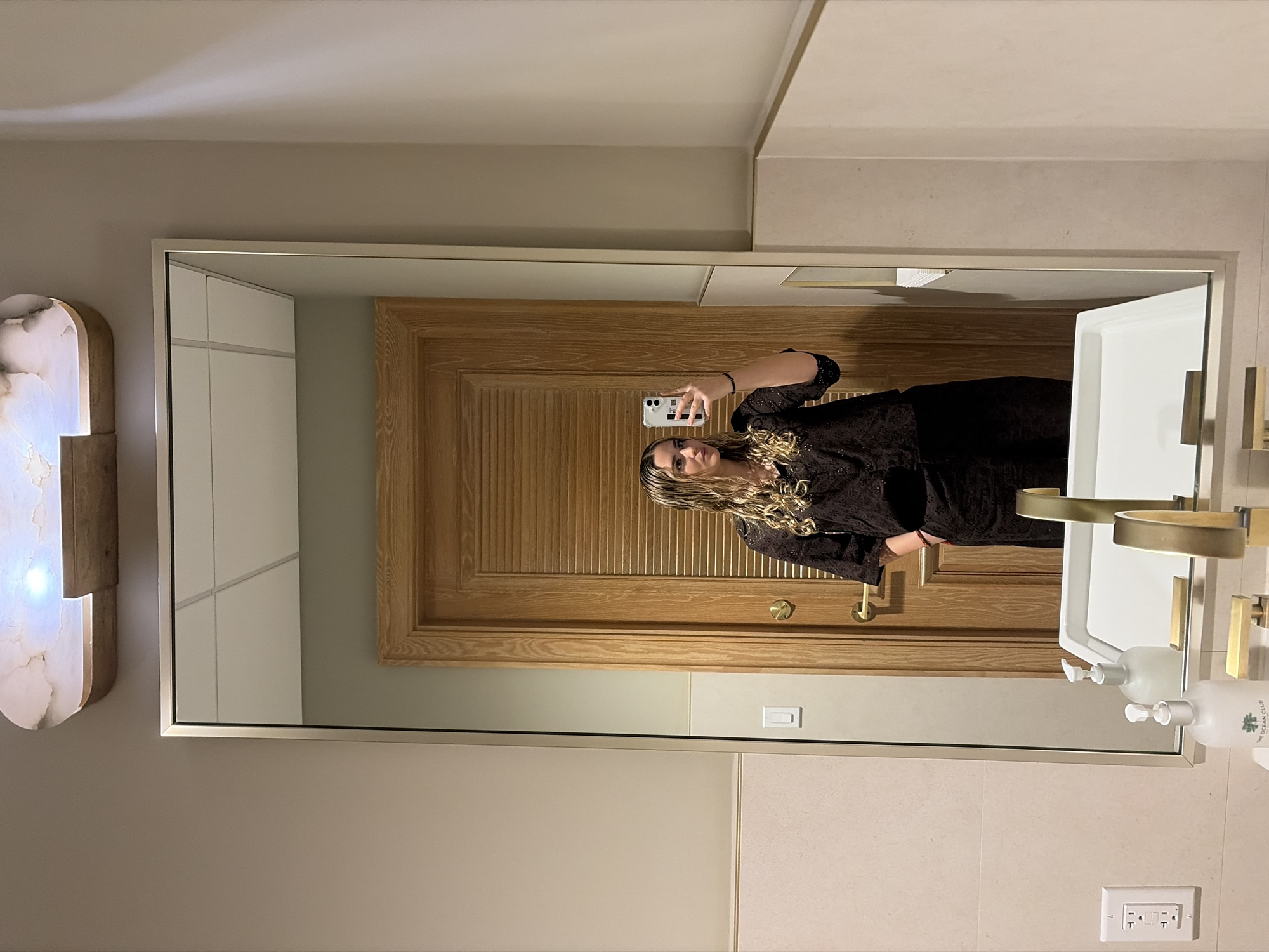 A woman with blonde hair is taking a selfie in a bathroom mirror. The bathroom has beige walls and includes a marble-like light fixture on the left. In the mirror's reflection, a wooden door is visible behind the woman. The bathroom also contains a white sink and gold-colored fixtures. A power outlet with three holes is visible on the lower right part of the wall. There is a hand soap dispenser on the right. The wall tile is made of beige colored bricks. Based on the brand name "THE OCEAN CLUB" on the soap dispenser, the location is the Ocean Club in Key Biscayne, Florida, United States.