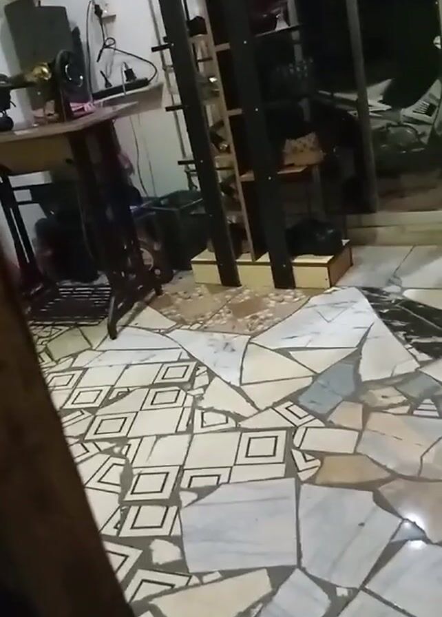 The camera is pointed at the floor of a room, which is made of irregularly shaped tiles