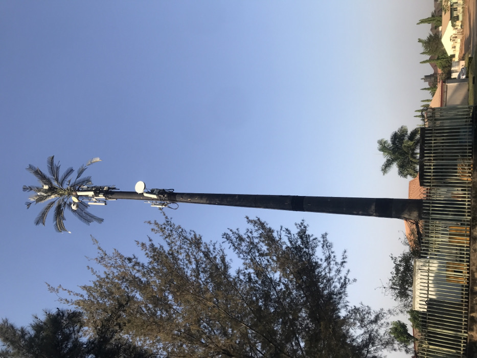 A telecommunications tower disguised as a palm tree stands tall against a bright blue sky