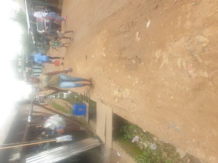 The image displays an unpaved, reddish-brown dirt street in Aba, Nigeria, under daylight conditions. The ground is visibly littered with various debris, including paper and plastic. In the foreground, a young adult female stands centrally, facing the camera. She is dressed in a light-colored short-sleeved top, light blue jeans, and open-toed sandals. She holds a small, white, irregularly shaped object in her right hand. To her immediate right, an open concrete drainage ditch containing green vegetation and additional litter runs parallel to the street. A blue plastic crate rests on the ground near this ditch. Wooden planks are positioned across a section of the ditch in the mid-ground. Along the left side of the street, a rudimentary stall or storage structure made of wooden posts and corrugated metal sheets is visible, displaying numerous plastic containers and bottles. Stacked corrugated zinc sheets are present in the lower-left corner. Further down the street, a male individual in a blue shirt holds a red bucket. Behind him, a group of three people is observed near a dark-colored vehicle, possibly a van or bus. This group includes a person wearing a white head covering, a child in a dark shirt, and another child in a colorful patterned outfit. In the distant background, a multi-story building with a green roof is partially discernible through atmospheric haze. No distinct interactions between individuals are apparent.