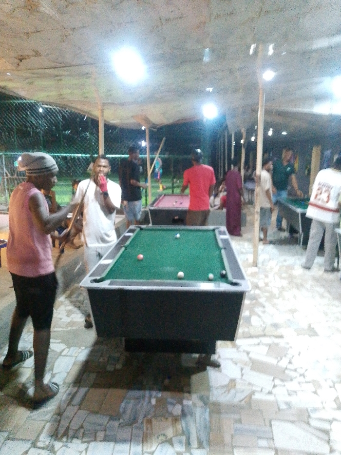 Under a covered outdoor space with multiple overhead lights, people are gathered around pool tables, apparently playing billiards. One table, prominently in the foreground, displays several balls. Figures stand around the tables, some holding pool cues. The floor is tiled with a mosaic pattern. In the background, there is a fenced area with greenery.