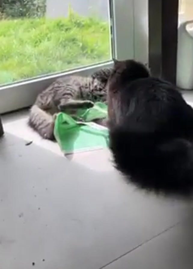 A video shows two cats interacting on a tile floor next to a window. A gray tabby cat stands on a green bag and looks down towards a black cat lying near the bag. The window is to the left and shows a green grassy area outside.