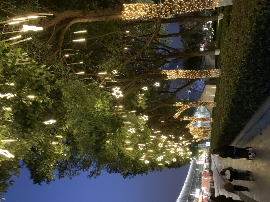 The image depicts an illuminated urban outdoor area in Xiaoshan District, China, at night. The sky is dark blue. A paved walkway extends into the distance, bordered by a row of trees with green foliage and a dark green hedge on the right. The trees are extensively decorated with warm white LED lights. Numerous five-pointed star-shaped lights hang from branches, interspersed with cylindrical tube lights that emit cascading light effects. The trunks and primary branches of several trees are wrapped with string lights. In the background, to the left, a building with illuminated windows is visible, and further right, the silhouettes of other tall structures are discernible against the night sky. On the paved walkway, four individuals are present, walking away from the camera. An adult figure is partially visible on the far left. Two children, one in light clothing and the other in dark clothing, walk in front of a third adult. This adult is pushing a dark-colored stroller.