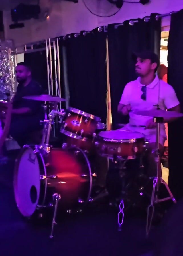 live band performing in a dimly lit, purple-hued space, likely a bar or club. A drummer wearing a white shirt and a black cap is playing a Pearl drum kit. To the left of the drummer, a man in a black shirt is playing another instrument. A woman in a white dress sits on a chair and seems to be adjusting her clothes. A black curtain hangs in the background, and a wall-mounted fan is visible near the ceiling. A flat-screen television is seen in the background, displaying a bright image. Another woman wearing a black dress dances near the center.