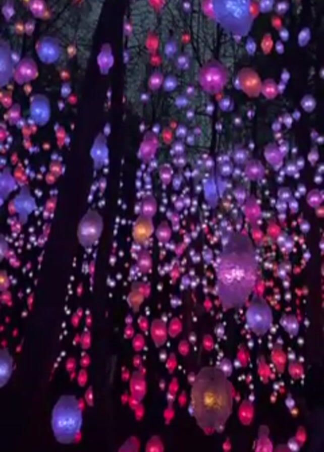 dark wooded area illuminated by countless colorful hanging lights. The lights are mostly spherical in shape and glow in a variety of colors, including shades of red, pink, purple, and blue. The lights are suspended from tree branches, creating a magical and ethereal atmosphere. The camera angle is looking upwards, emphasizing the density and abundance of the lights. The trees themselves are dark and silhouetted against the background, adding to the nighttime ambiance.
