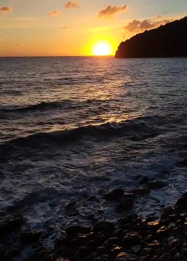 rocky shoreline at sunset. The sun is setting over the ocean, behind a silhouette of land on the right of the frame. The waves gently lap against the shore. The pebbles on the shore are dark, and the water reflects the golden light of the sunset. There are a few clouds visible in the sky.