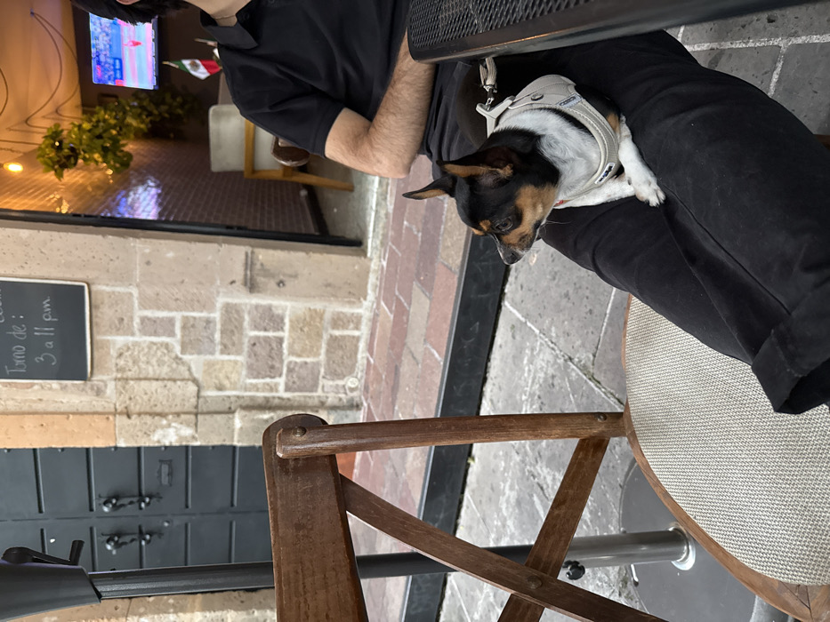 The image depicts an outdoor seating area of a commercial establishment in Morelia, Mexico. A person, visible from the chest to the upper thighs, wearing a black polo shirt and black pants, is seated at a dark-colored metal table. Resting on the person's lap is a small tricolor dog with black, white, and tan markings, wearing a light gray harness, looking intently towards the left side of the frame. In the foreground, a wooden chair with a light-colored upholstered seat is partially visible, positioned next to a silver-colored umbrella stand base. The background features a building constructed of reddish-brown "cantera rosa" stone, characteristic of Morelia's architecture. A black chalkboard sign mounted on the stone wall displays white chalk text, "Torno de: 3 a 11 pm". To the left of the sign, a dark, possibly black, wooden double door with ornate metal handles is visible. To the right, an open doorway reveals the interior of the establishment, which includes hanging plants, exposed lightbulbs, a light-colored chair, a flat-screen television displaying what appears to be a sports broadcast with a green field, and a small Mexican flag. The ground features varied stone paving, with reddish-brown brick sections and lighter gray flagstones.