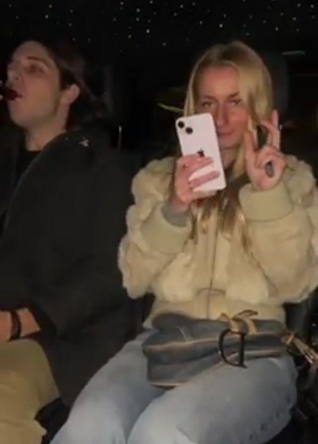 Inside a vehicle with a star-lit ceiling, a woman with long blonde hair sits next to a man. The woman holds a lilac iPhone, taking a photo or video while making a hand gesture. She wears a light-colored jacket, blue jeans, and has a dark purse with a "D" logo slung over her shoulder. The man is on her left, wearing a dark coat and light-colored pants, and he appears to be speaking while holding something in his mouth. The environment suggests they are in a car, likely at night.