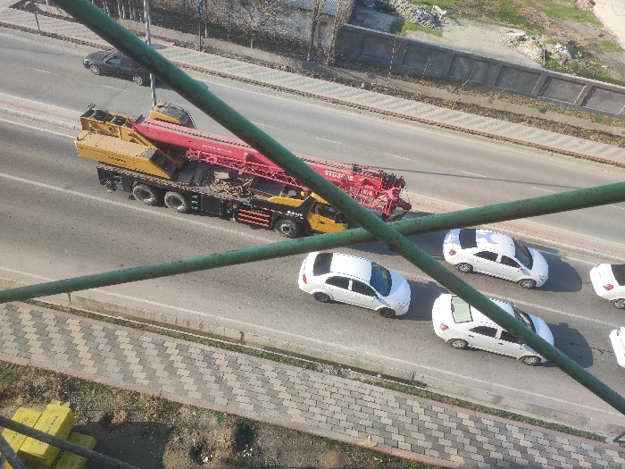 An elevated, downward-angled photograph depicts a street scene in Jizzakh, Uzbekistan. Two prominent green metal bars diagonally intersect the foreground. The primary subject is a multi-lane asphalt road with a central divider. A large yellow and black mobile crane truck, identified by a red boom and "Sany STC3" text, travels towards the right. Four white sedans are observed in adjacent lanes, also proceeding towards the right. A single dark-colored sedan is visible in a left-most lane, moving in the opposite direction. A patterned grey and white tiled sidewalk runs parallel to the road on the left. On the right side of the road, beyond a low concrete barrier, an unpaved area featuring sparse vegetation and scattered construction debris is present. Bare trees and light-colored buildings are visible in the background. A stack of yellow rectangular objects is partially visible in the bottom left corner. No individuals are discernible in the frame.