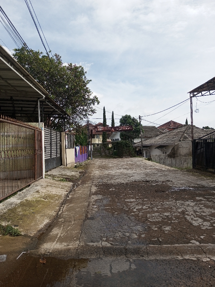 A narrow, cracked road stretches between houses with gated yards. A weathered metal awning and fence stand on the left, while a similar structure is visible on the right. Laundry hangs in the distance near a vibrant purple wall. A large tree casts shade. The sky is overcast, and power lines crisscross overhead, adding to the residential feel.
