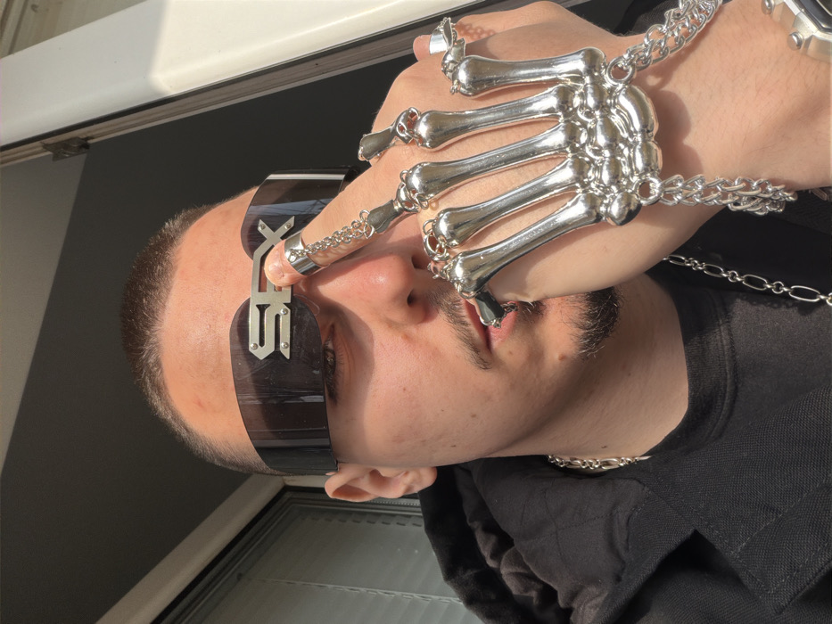 A young adult male, with short dark hair, a mustache, and a short goatee, is depicted in a close-up, illuminated by natural light from the left. He is wearing dark-tinted, wraparound-style sunglasses featuring a prominent silver metallic attachment on the bridge that spells "SEX" in capital letters. He has a silver-colored chain necklace with elongated oval links visible around his neck, worn over a dark garment, possibly a hooded jacket or sweatshirt. His right hand, adorned with an elaborate silver-colored articulated skeleton hand accessory covering the back of his hand and fingers, is raised. The middle finger of this skeletal accessory is extended and slightly bent, positioned near the bridge of his sunglasses. A silver-colored wristwatch is partially visible on his left wrist. The subject is looking directly forward. The background, which is out of focus, shows elements of an indoor or sheltered outdoor setting, including a dark window frame with blinds on the left and a light-colored doorframe or wall section with a visible hinge on the right. The scene is observed to be located in Varna, Bulgaria.