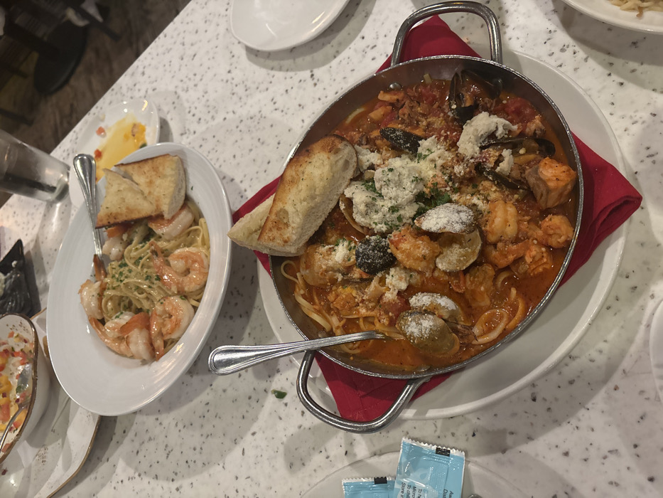 - "A white speckled table displays a seafood pasta dish served in a silver pan with handles, garnished with bread and sprinkled with cheese" by FM-97btd2, licensed under CC BY 4.0