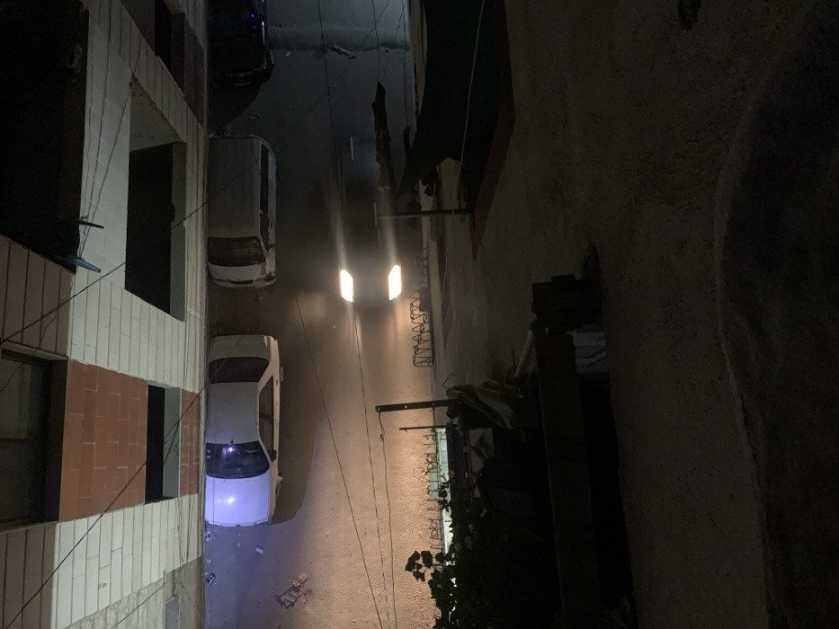 This image presents an overhead nighttime view of an urban or semi-urban outdoor area in Ma'raba, Syria. The upper section of the frame displays the undersides of building structures, featuring white tiled or painted surfaces interspersed with sections of exposed reddish-brown brickwork. Directly beneath these structures, a paved street or alleyway hosts three parked sedans. The leftmost sedan is white and exhibits an activated interior light. A second white or light-colored sedan is positioned to its right, followed by a dark-colored vehicle, only partially visible. Two prominent, square-shaped streetlights centrally illuminate the paved surface and extend light towards the foreground. Numerous utility wires are visible traversing horizontally across the scene at varying heights. In the lower left foreground, a dark, dense mass of foliage coexists with an assortment of indistinct, dark objects. To the right of this, under the direct illumination of the streetlights, several empty metallic bicycle racks are arranged on a lighter, possibly gravel or dirt, ground surface. Further to the right, a large, dark, elongated object, consistent with a boat hull or a substantial container, rests on the ground in a shadowed area. The ground surface transitions from paved sections to unpaved, rougher terrain in the foreground. No individuals or active events are depicted.