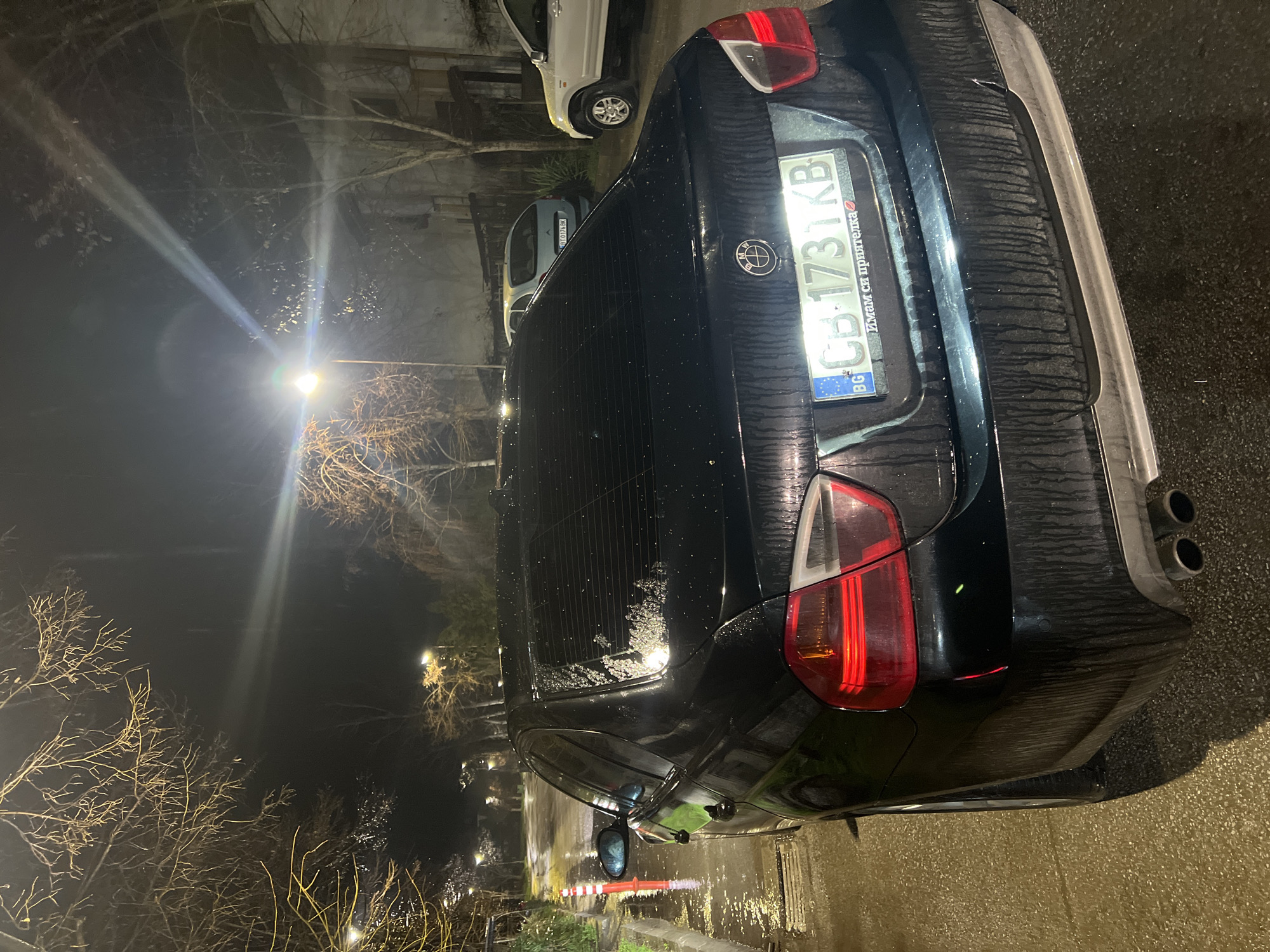 The image depicts a nighttime street scene in Strazhitsa, Bulgaria, following or during precipitation, evident from wet surfaces and water droplets. A dark-colored BMW sedan, bearing Bulgarian license plate "CB 1731 KB," occupies the foreground, parked on a wet asphalt street. The vehicle's rear passenger side is visible, showing water streaks on its body and a wet rear window. A chrome BMW emblem is centered on the trunk lid above the license plate, which features a frame with Bulgarian text reading "Имам си приятелка" and a small red lips icon. The car has twin exhaust pipes on its left rear. To the left of the BMW, a wet concrete curb borders the street, featuring an orange and white striped flexible bollard or traffic cone. Overhead, numerous bare-branched deciduous trees are visible against the dark sky. Multiple streetlights illuminate the scene, casting bright light and creating lens flares. In the mid-ground, a light blue hatchback with Bulgarian license plate "CB 0174 BK" is parked further down the wet street. Behind it, a light-colored SUV is partially visible. Buildings are partially discernible through trees in the background, including a structure with a light-colored facade. No individuals are present.