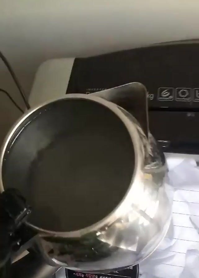 Here is a detailed description of the video: The video shows someone filling a stainless steel electric kettle with water. The person opens the kettle's lid, revealing the water inside, then closes it. A washing machine is visible in the background. The kettle is sitting on top of some white fabric, possibly clothing, and a piece of paper with Korean writing on it. The scene is indoors, with a white wall visible behind the objects. The person's hand is dark-skinned.