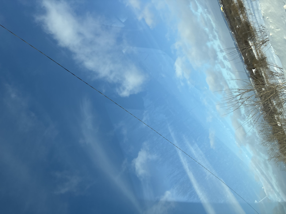 A bright blue sky filled with wispy cirrus clouds dominates the view. A single power line stretches diagonally across the image. On the right side, winter trees with bare branches line a snowy embankment. The scene is slightly distorted, possibly viewed through a window.
