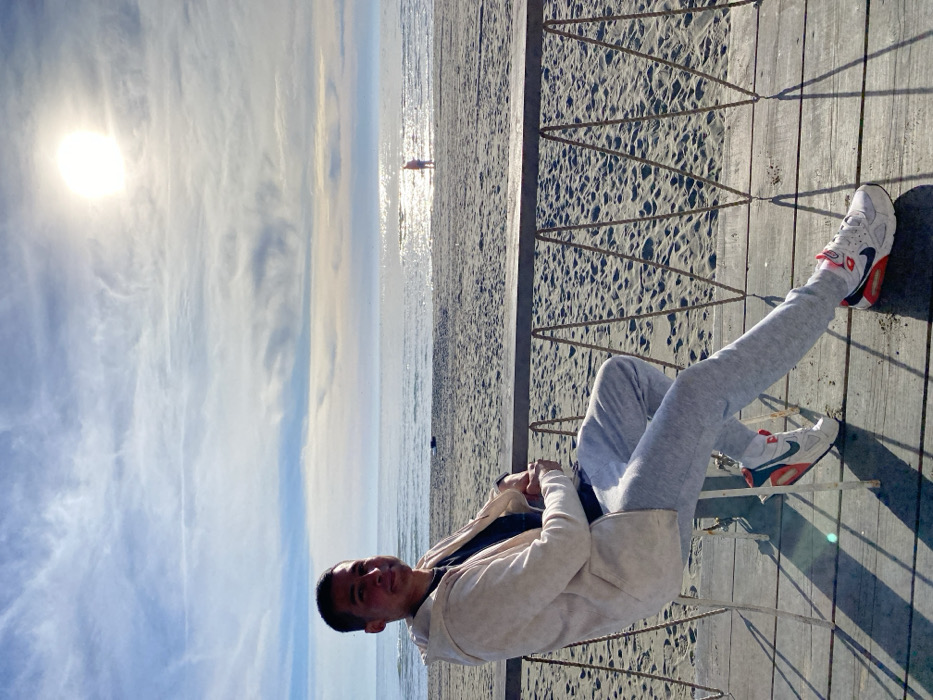 A young man relaxes on a boardwalk, clad in gray sweatpants and a light-colored hoodie. His feet, adorned with white and red sneakers, rest on the railing. Behind him, a sunlit beach stretches into the distance, where a lone figure can be seen. The sky, a mix of blue and clouds, adds to the tranquil scene.