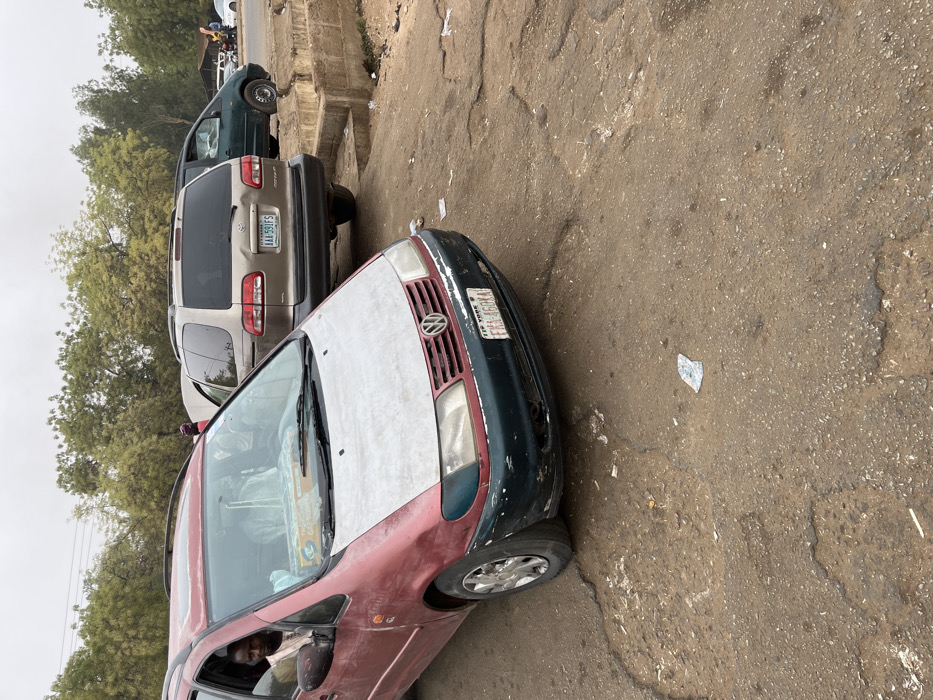 The image depicts an outdoor scene in Kasuwan Kaji, Nigeria, featuring multiple parked minivans on a degraded, unpaved or heavily potholed asphalt surface. In the foreground, slightly angled towards the right, is a maroon (dark red) Volkswagen Sharan minivan. Its hood is a contrasting faded light grey or unpainted, and the front bumper is dark green, showing extensive scuffing, chipping, and damage, including a missing section on the lower passenger side. The vehicle bears a front license plate "FKA 460 KA" with "TFP YOB" above it. A male individual with a beard, wearing a light-colored garment, occupies the driver's seat, looking directly towards the camera. Indistinct figures are visible in the rear passenger seats. A package, possibly labeled "Peace Essential," rests on the dashboard. The driver's side front tire appears underinflated. Behind and to the right of the Volkswagen is a gold/tan Toyota Sienna minivan, parked facing away from the viewer. Its rear bumper exhibits a noticeable dent on the passenger side. This vehicle's license plate reads "AAA-591FS" with "ABUJA" displayed above. Partially visible between these two vehicles, near the front of the Toyota Sienna, is a person wearing a red head covering. Further in the background, to the right of the Toyota Sienna, a dark green minivan is partially visible, parked on what appears to be a slightly elevated, cleaner road surface. A low, damaged concrete barrier or curb separates the foreground area from this elevated section. The ground surface is uneven, dark brown/grey, and littered with various small fragments of white paper or plastic. The background features numerous green trees with sparse foliage under an overcast sky.