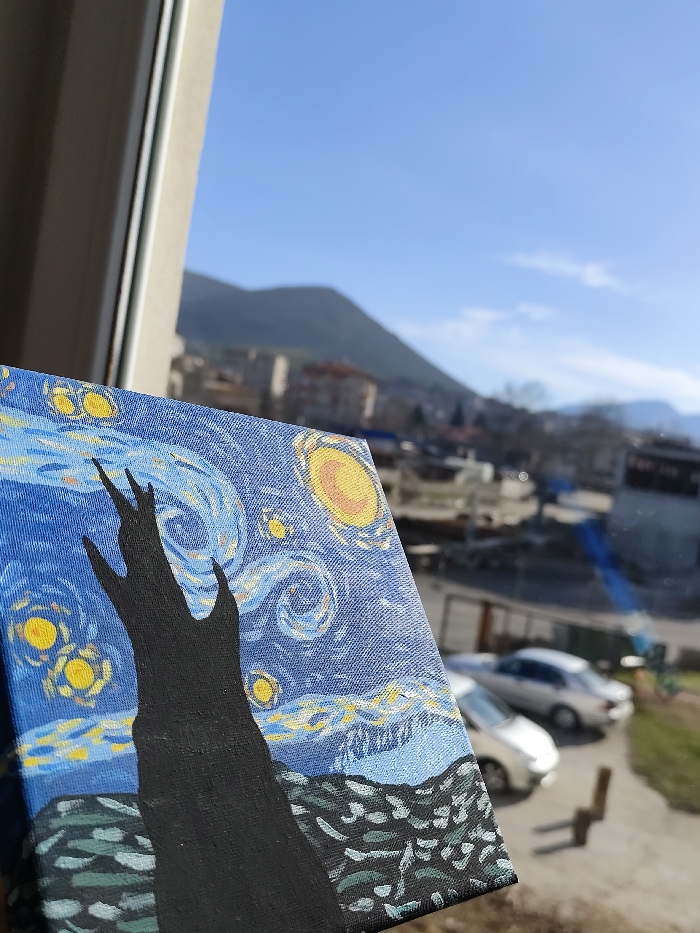The image displays a small canvas painting, a rendition of Vincent van Gogh's "The Starry Night," positioned in the lower-left foreground