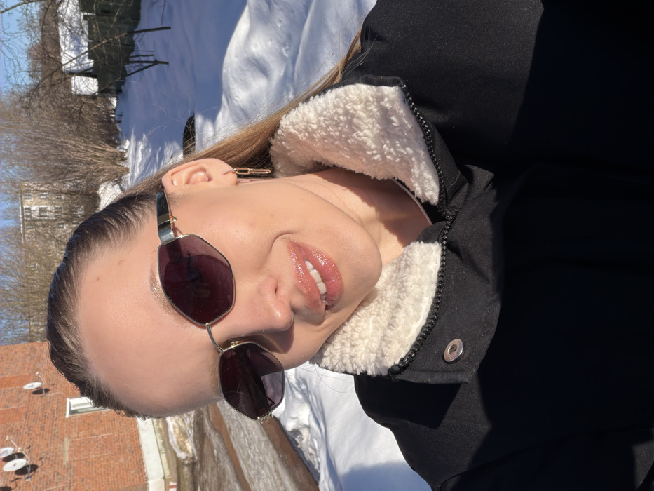 An outdoor, eye-level photograph captures a young adult female positioned against a winter landscape in Reshetnikovo, Russia. The subject, positioned centrally and looking directly at the camera with a smile, wears dark, hexagonal-framed sunglasses with gold-colored accents and a gold-colored chain-link earring on her visible right ear. She is dressed in a black winter jacket featuring a prominent cream-colored sherpa collar and a silver snap button on the front. Strong sunlight illuminates the scene, casting distinct shadows. The background includes a snow-covered ground plane. To the left, a multi-story brick building with multiple white satellite dishes and a window is partially visible. To the right, a snow-covered area with bare deciduous trees and shrubs extends into the distance, where a light-colored multi-story building and a wooden fence are discernible under a clear sky.