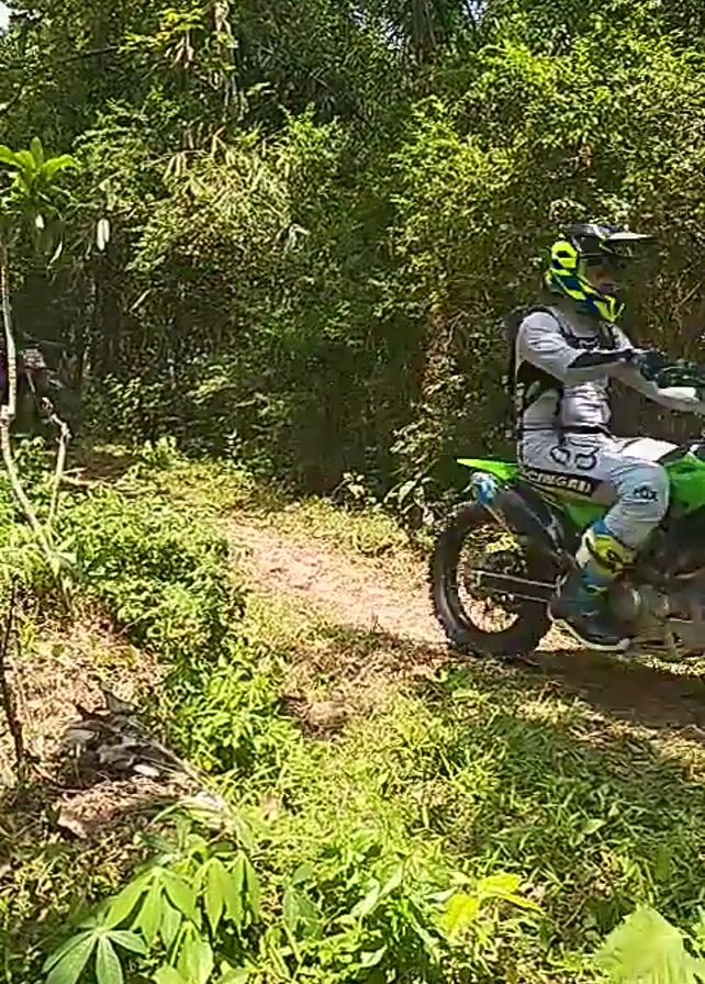 dirt trail through a forest, with motorcycles passing by. Two motorcycles drive up the trail from left to right. The first is green, and the second is black and pink. The trail is lined with greenery, and trees surround the trail. The sun is shining through the trees.