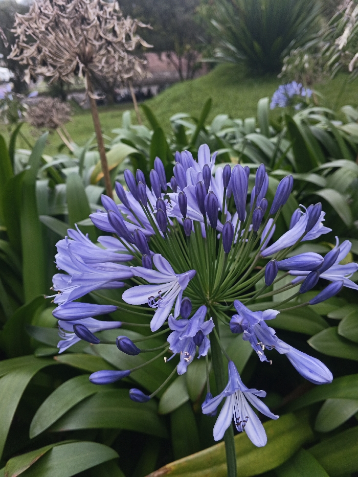 A vibrant close-up captures a cluster of Agapanthus flowers in full bloom, showcasing their delicate purple petals and prominent stamens. The flowers form an umbel shape, bursting from a central point amidst lush green foliage. Behind the blooming flowers, a dried Agapanthus flower head stands tall. In the soft background, a grassy hill and additional greenery create a natural, tranquil setting.