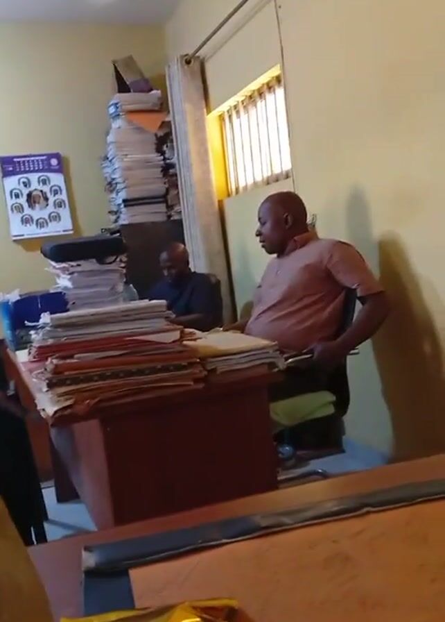 The video depicts an office space. Two men are visible behind a large desk piled high with files. One man is looking at the camera with a slight smile, while the other is working at the desk. The room appears to be busy, with several other individuals scattered around desks and chairs. Some are engaged in activities such as writing or looking at paperwork. A ceiling fan is rotating. The lighting in the room is adequate, and the walls are painted a light color. There is a window on the right side of the frame.