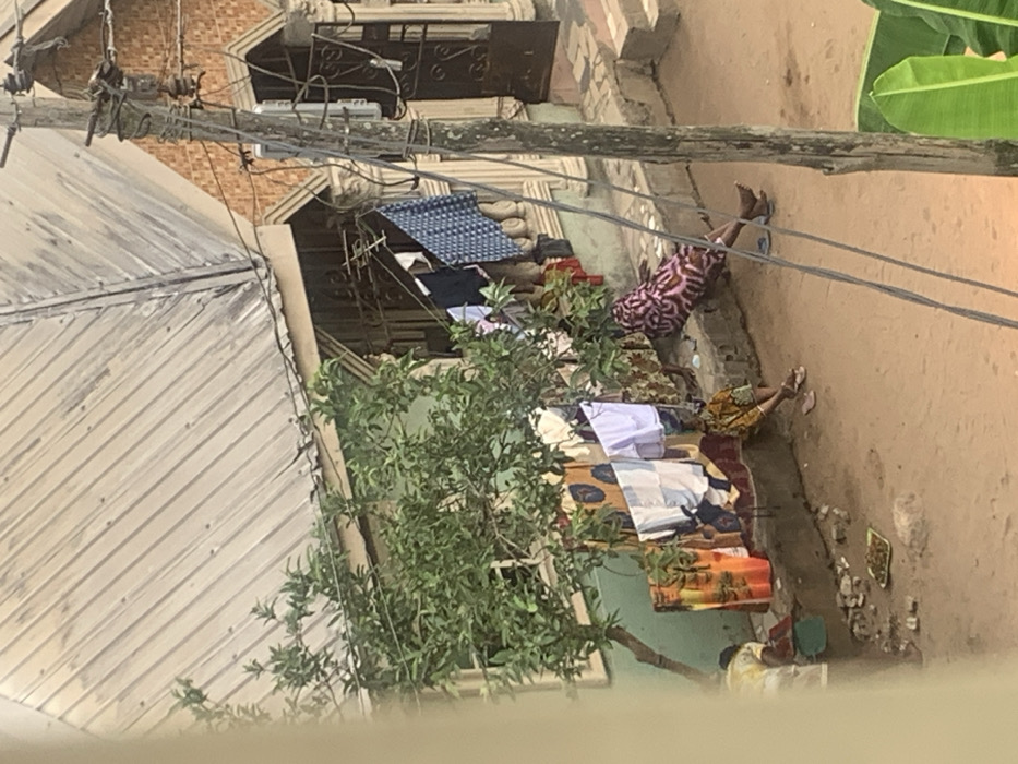 The scene is located in Umuode, Nigeria. A residential structure with a corrugated metal roof, light green painted walls, and decorative brickwork occupies the background, featuring ornate metal security doors and grilles. Numerous items of laundry, including patterned fabrics and white garments, are suspended on lines stretched across the building's facade. Three individuals are present on a low concrete ledge in front of the residence. One individual, centrally positioned, wears a patterned pink, red, and black dress, reclining barefoot. To their left, another person in a yellow and brown patterned garment sits facing away from the camera; a pair of light-colored flip-flops rests nearby on the dirt ground. A third, partially obscured individual is visible further to the left, near the ground. The ground surface is composed of reddish-brown dirt. To the left, a light green plate containing food is visible on the dirt, surrounded by scattered small rocks and debris. A verdant tree with green foliage stands in front of the building, partially obscuring the lower section. In the right midground, a wooden utility pole with multiple attached electrical wires and a grey utility box is prominently positioned. Banana leaves are visible in the bottom right corner of the frame.