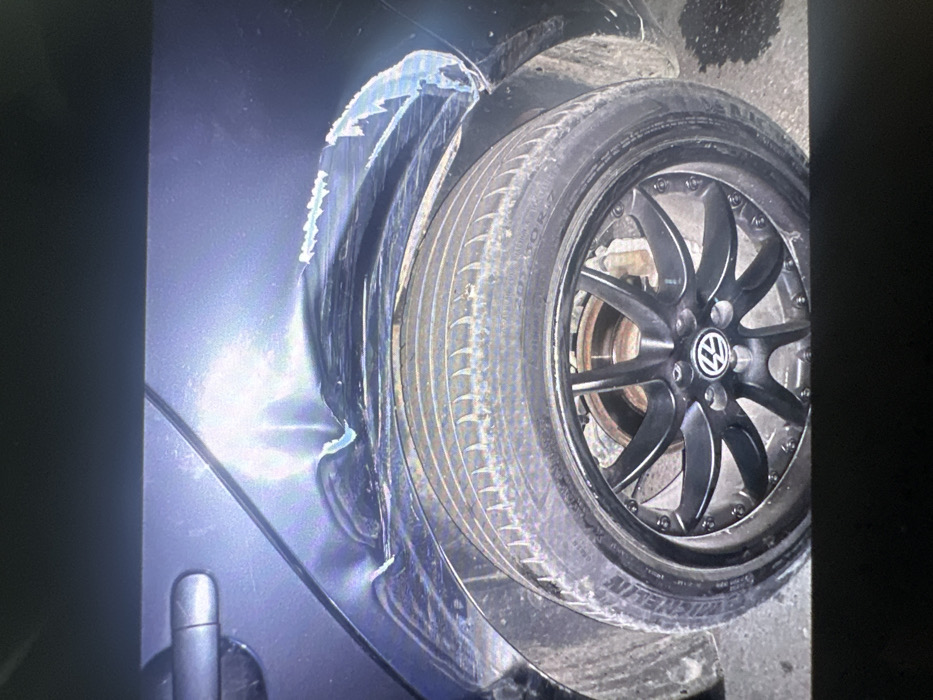 - "The image displays the severely damaged rear passenger side of a dark-colored vehicle, identified as likely a Volkswagen by the wheel's center cap, situated in Reselets, Bulgaria" by FM-Eq6832, licensed under CC BY 4.0
