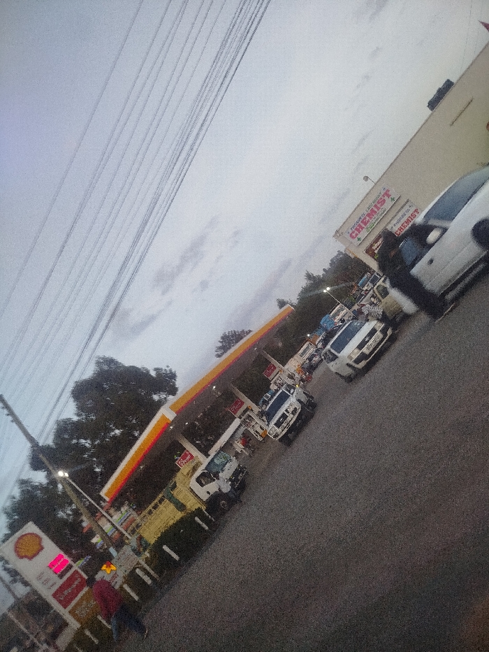 A Shell gas station under a cloudy sky, with a line of vehicles parked near the pumps. A chemist store is adjacent to the gas station. A person in a red hoodie walks past the Shell price sign in the foreground. Utility lines stretch across the upper portion of the frame. The image has a tilted perspective.