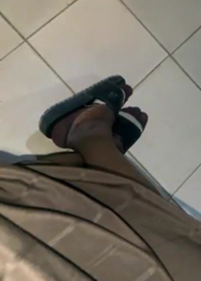 person sitting on what appears to be a tan or brown fabric-covered seat. The person is wearing dark nylons and black sandals with a white stripe. The floor is tiled with square, white tiles. The lighting is indoor and slightly dim.