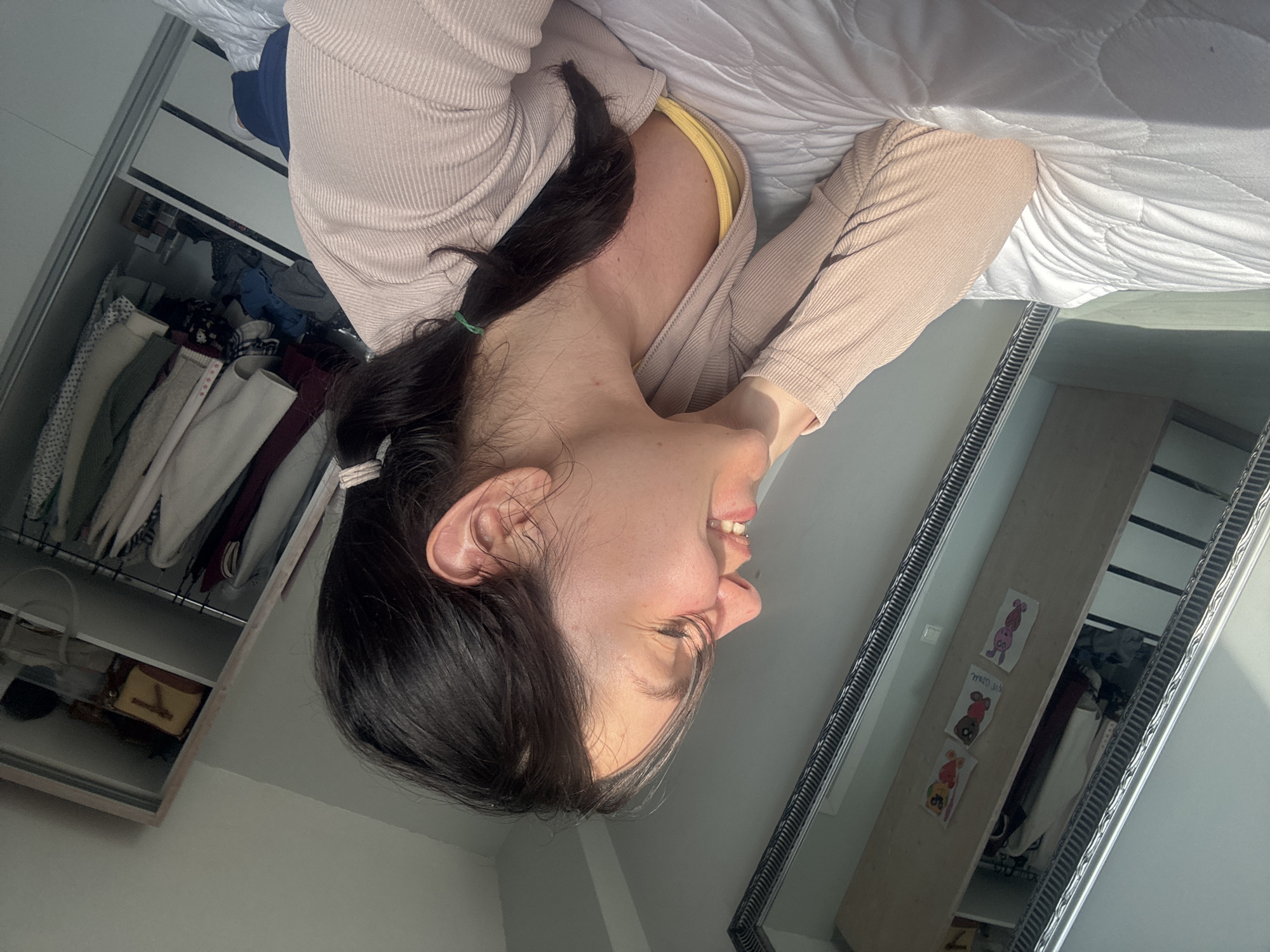 A young woman is lying on a white bed, possibly in a residential setting. She is wearing a light pink cardigan and a yellow top. Her dark hair is pulled back in a ponytail. Her face is visible in profile. The room contains a wardrobe with clothes and a mirror reflecting various items, including drawings or pictures attached to a surface. There is no information in the image to determine if the location is in the city of Burgas, Bulgaria.