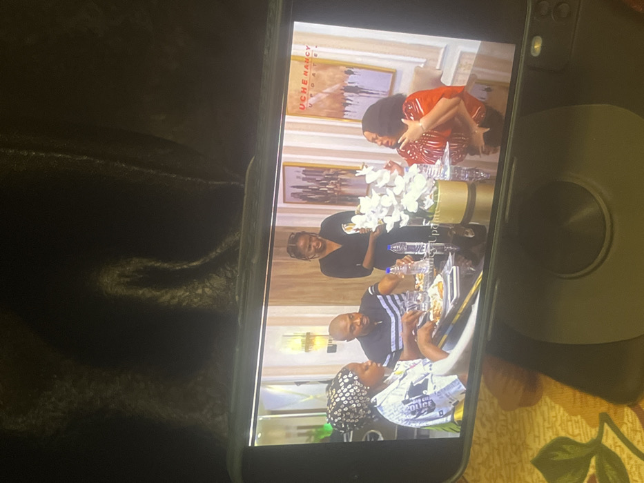 A cell phone displays a scene from "Uchenancy Update." Five individuals sit around a table, possibly for a meal. The setting includes wall art and a floral centerpiece. Two women stand behind the table, one in a red outfit gesturing dramatically. A leather surface is visible to the side of the cell phone and what appears to be the back of another phone.