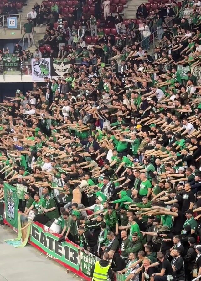 In a medium-shot video, a large crowd of predominantly young adults is gathered in what appears to be a stadium. The majority of the crowd is wearing green and white clothing. They are standing close together and appear to be performing a synchronized arm movement, extending their arms forward with their fists clenched. A banner with the words "GATE 13" can be seen near the front of the crowd. The upper rows of the stadium are filled with spectators, creating a dense mass of people. The overall atmosphere appears energetic and spirited, suggesting a sporting event or a large public gathering. The lighting in the stadium is bright, illuminating the scene clearly. Several security personnel are visible near the front of the crowd, maintaining order and overseeing the event.