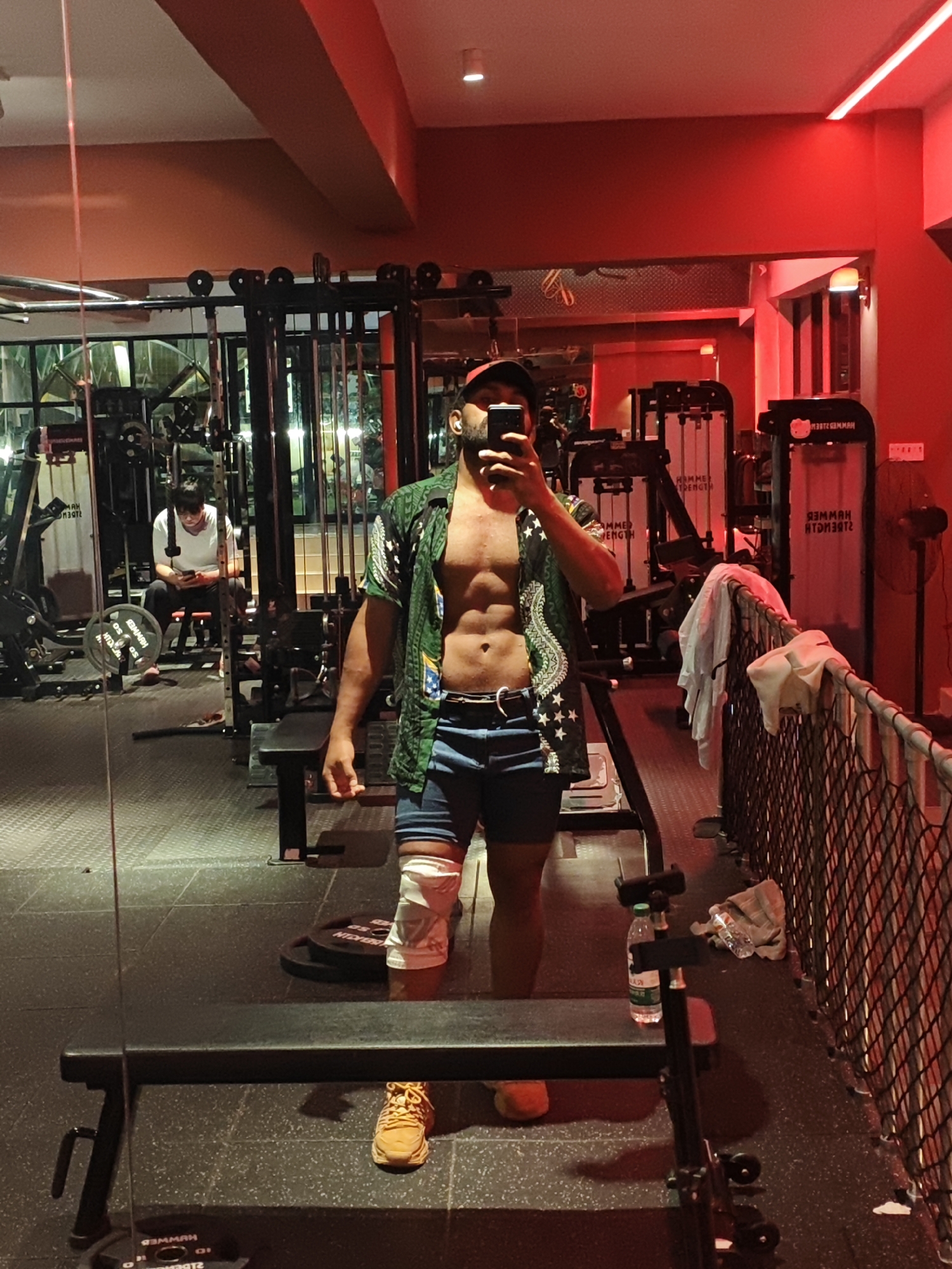 The scene depicts the interior of a fitness center, located in the Chongqing High-tech Zone, China. A male subject is prominently featured in a mirror selfie, capturing his upper body and waist down. He has a dark complexion, a beard, and wears a red baseball cap, an unbuttoned dark green patterned short-sleeve shirt revealing a toned abdomen, blue shorts over compression shorts, and tan sneakers. A white bandage or wrap is visible on his left knee. He holds a dark-colored smartphone to take the photograph. In the background, visible through the mirror, another individual with short dark hair is seated on an exercise bench, wearing a white t-shirt and dark trousers, engaged with a smartphone. The gym is equipped with various weight machines, several of which bear the "HAMMER STRENGTH" branding (seen in reverse). A 20kg barbell plate is on the floor near a bench. The gym floor is dark, textured rubberized material. The facility features predominantly red ambient lighting on the walls and ceiling, complemented by some white light fixtures. Large windows in the far background show an illuminated exterior environment. To the right, a black mesh fence is present, draped with a white cloth. A water bottle and a crumpled towel are on the floor near the fence. A fan and a machine with a "Hello Kitty" emblem are also visible in the reflection on the right.